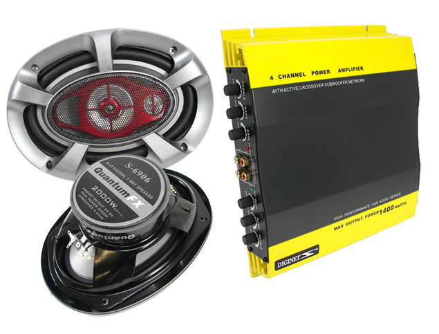 Image Title: 4 Channel 1400W Car Audio Amplifier Two 2500 Watt 6x9" Speakers Power